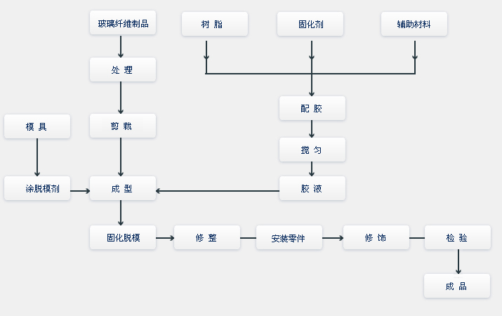 手糊成型法又稱(chēng)接觸成型法,其成型過(guò)程為:加有固化劑的樹(shù)脂混合料和玻璃纖維制品手工逐層鋪放,在涂有脫模劑的模具上,浸膠并排除氣泡,層合至確定厚度,然后固化形成制件。